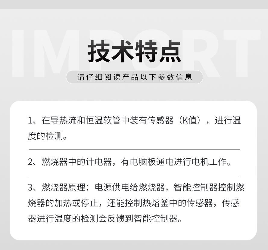 燃燒器原理:電源供電給燃燒器,智能控制器控制燃燒器的加熱或停止,還能控制熱熔釜中的傳感器,傳感器進(jìn)行溫度的檢測會(huì)反饋到智能控制器。