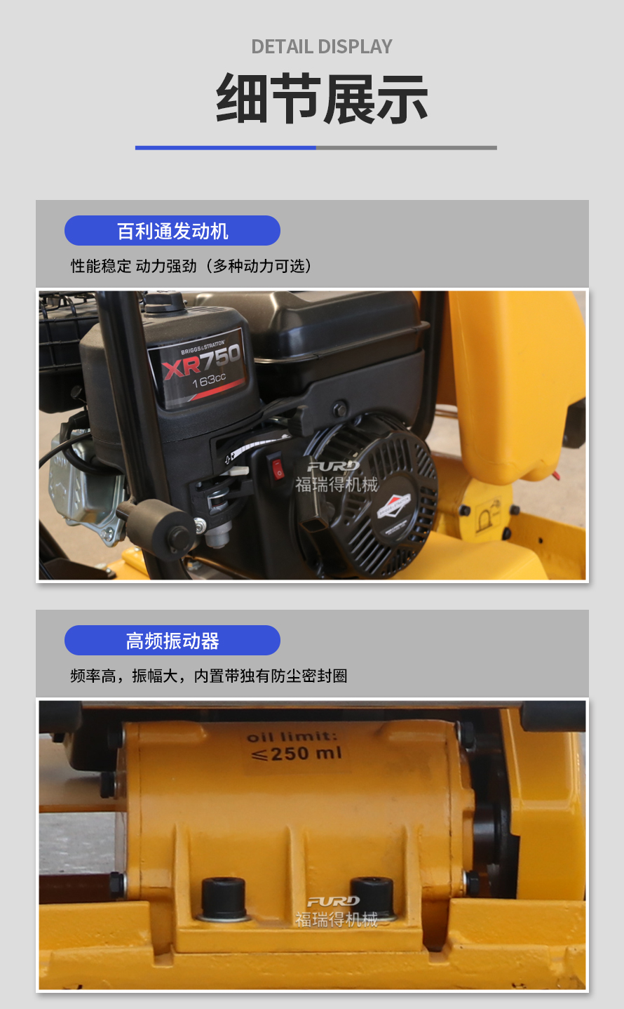 適用于路基邊緣、橋涵、管道、溝槽底部等狹長地帶的壓實。 本田汽油動力,名牌品質保證。